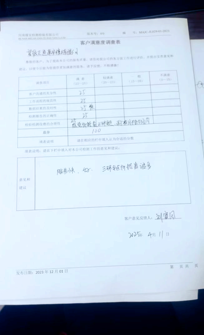 今后,我们将持续进行客户满意度调查和回访,认真听取客户建议,进一步提升服务质量,将检测业务做成尽善尽美。