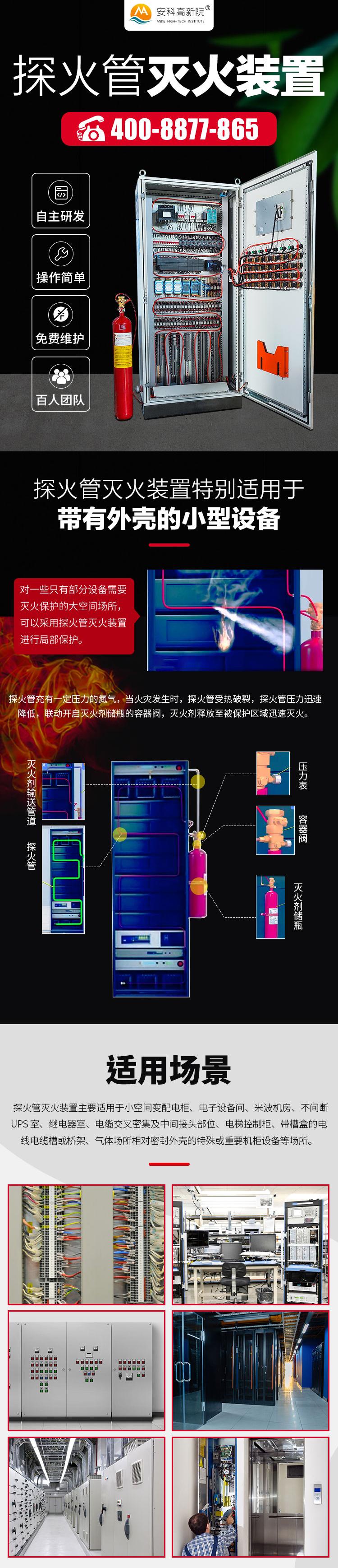 探火管灭火装置又叫火探管灭火装置,它是一个简单、低成本且高度可靠的独立自动灭火系统,它不依靠任何电源,只需用自身的储压便可进行操作。该系统主要被设计在类似于电气控制箱,机械房等密闭的空间,自动扑灭起火点火源。