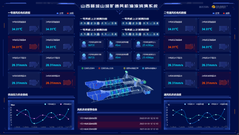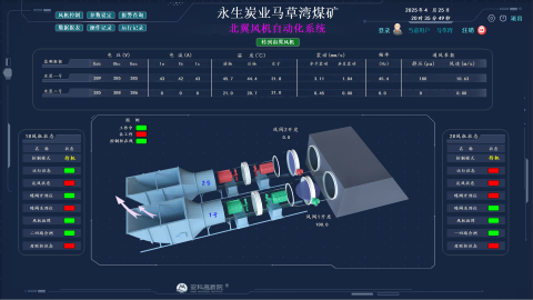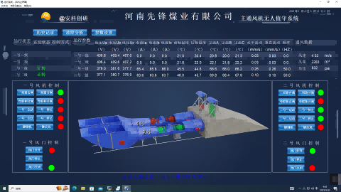 主通风机智能控制系统具备“三键、四自动“功能,三键:一键不停风倒机、一键启动、一键反风,四自动:定时自动倒机、故障自动倒机、定期自动润滑、蝶阀自动加热解冻。具备智能语音播报、智能调速、故障诊断预警和智能分析功能,具备与智能综合管控平台实现智能联动功能。以全流程智能化技术重构通风安全体系,以创新技术守护地下空间,用数据驱动智慧矿山未来!